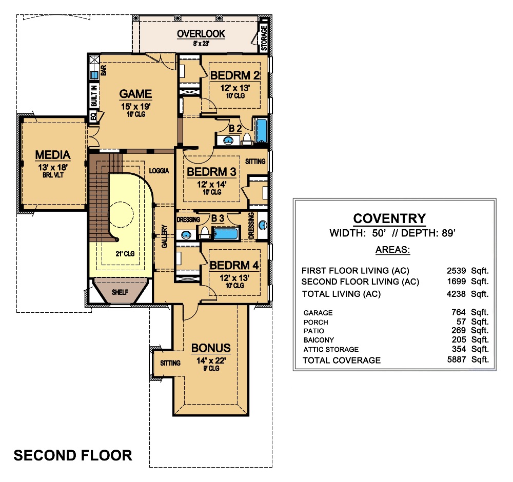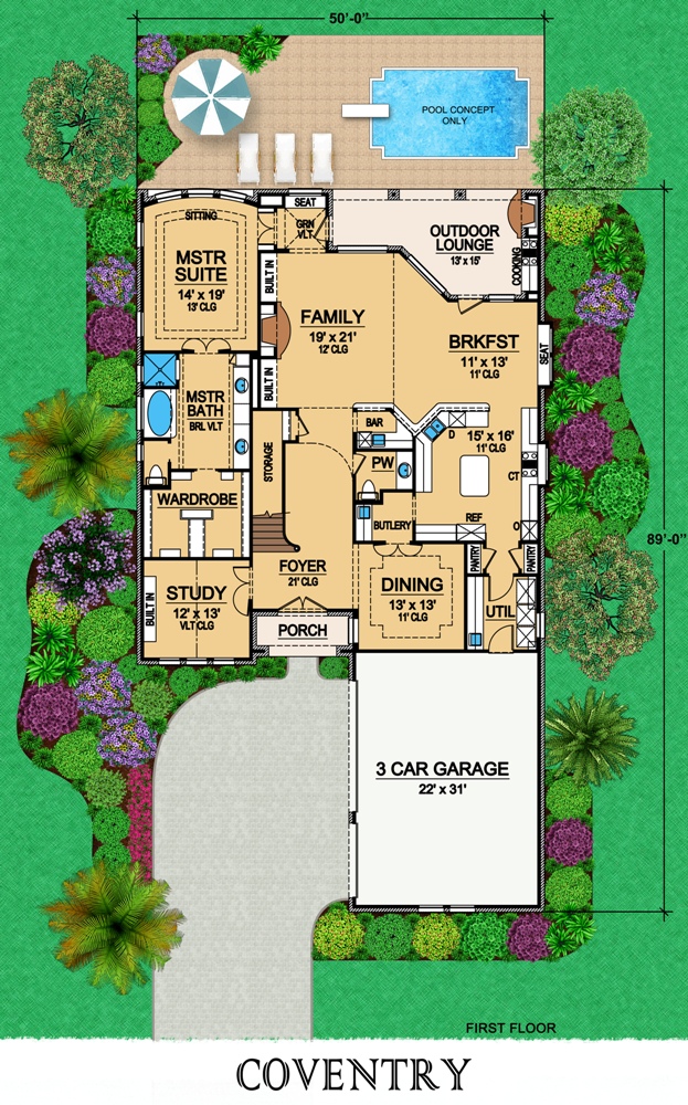 This luxury house plan would be the perfect choice for a narrow lot. The two story foyer opens to the elegant dining room on the right which has direct access to the butlery for ease in serving, to the left is a quiet study with built-in shelves for extra storage. The large kitchen offers a free-standing island and a breakfast bar that separates the kitchen from the breakfast. The breakfast area gives easy access to the outdoor lounge, where a fireplace and outdoor cook area allows for cookouts year around. The family room offers plenty of built-ins, and a cozy fireplace. The master suite has a bayed sitting area, trey ceilings and double doors into the lavish master bath. The master bath features a separate shower and bathtub, his and hers vanities, a barrel vault ceiling and a very spacious wardrobe. The second floor houses three family bedrooms with walk-in closets, full bathrooms. To complete the second floor, and this luxurious house plan is a media room with barrel vaulted ceilings, and a game room with built-ins and a bar.