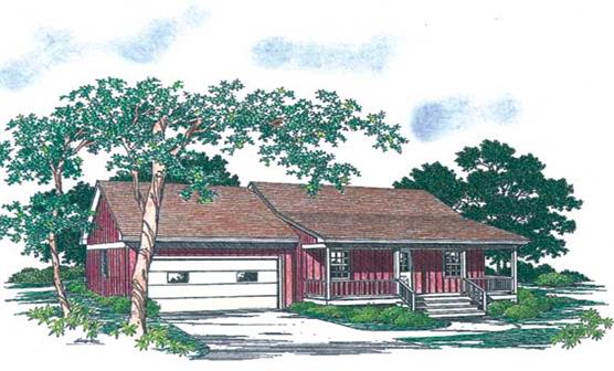 The comfortable country exterior is adaptable for either country or city living. A shed roof covers the full length porch and vertical siding enhances the look.