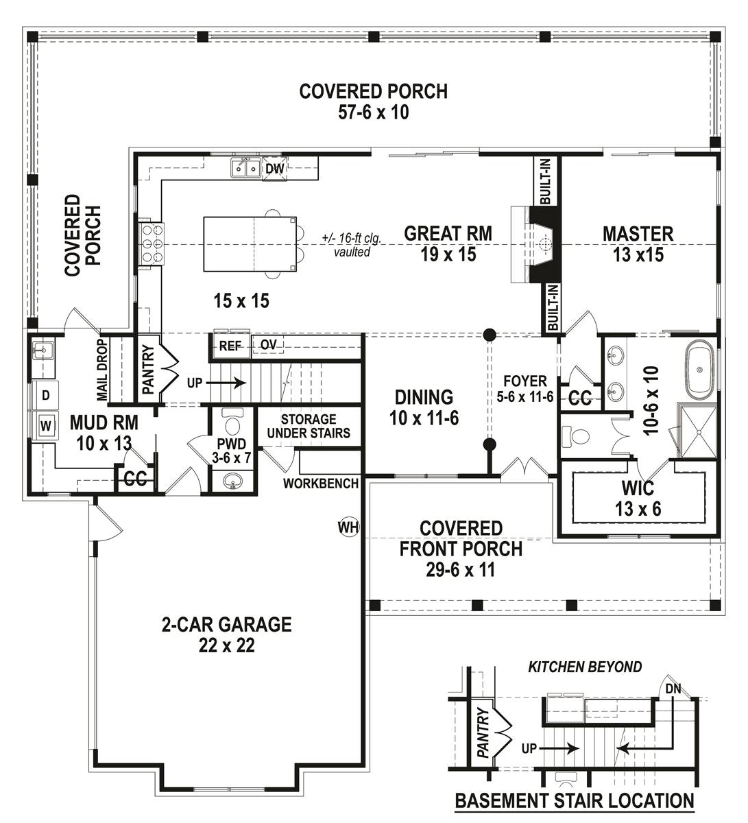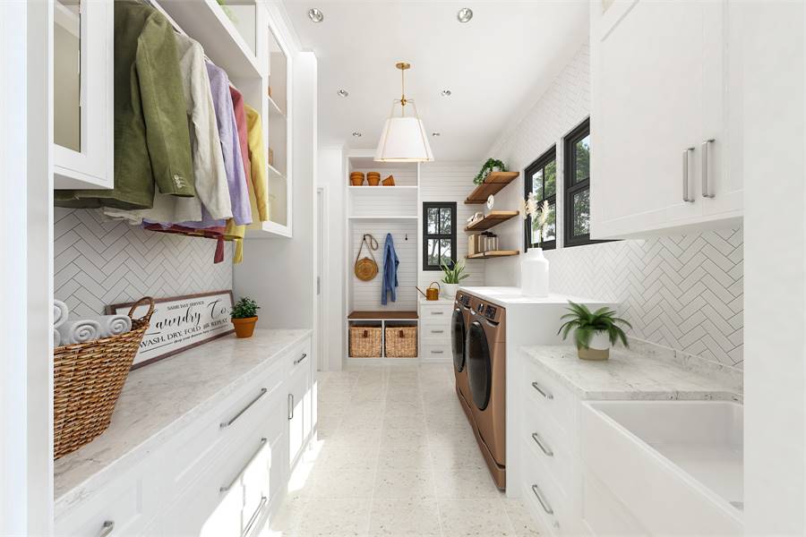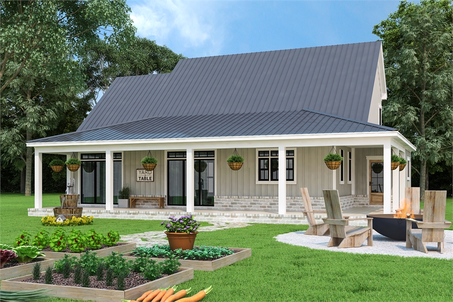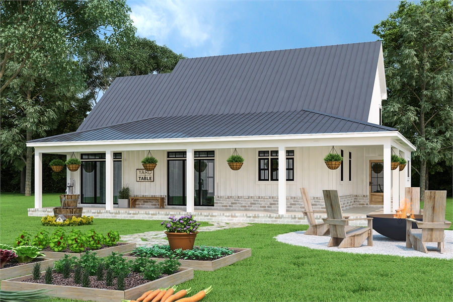 You’ll enjoy all 1,999 square feet of this practical Modern Farmhouse plan. With its 3 bedrooms, 3.5 bathrooms, sprawling wraparound rear porch, and functional multipurpose laundry/mudroom, this comfortable home plan is definitely designed to be lived in!  The covered front porch is a friendly welcome to this home. Inside, you’ll witness the open floor plan, which flows from the dining room, into the great room and state-of-the-art kitchen. The master suite, also located on the main floor, features a separate tub and shower and large walk-in closet. The first floor is complete with a half bath off the mudroom and a 2-car garage. The upper level of this design offers two secondary bedrooms, each with a walk-in closet and private bath. An unfinished bonus room above the garage can easily be utilized as a 4th bedroom.