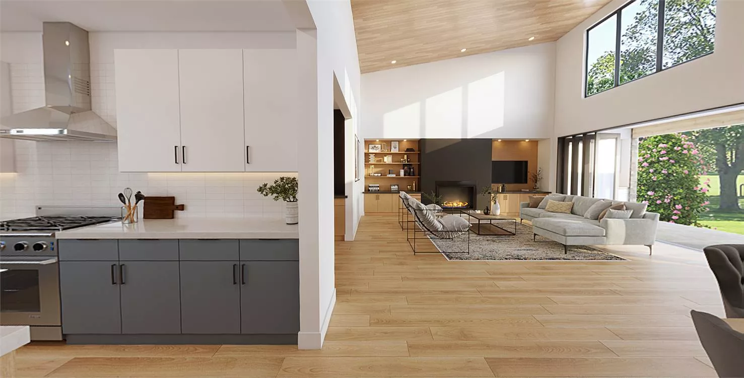 A vaulted grand hall anchors this contemporary house plan, serving as the central gathering spot. A back porch extends the entertaining area to the outdoors. A versatile study or office is found near the deluxe master suite, which boasts its own fireplace and a spa tub. The vaulted secondary bedrooms include a shared bath. The home's modern exterior is striking, yet certainly tasteful.