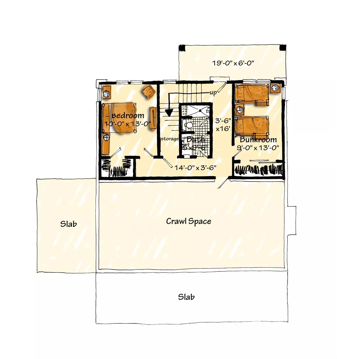 Down the stairs you’ll find a perfect setup for kiddos and guests to sleep. There is a large shared bath as well as storage and access to the outside, as well.