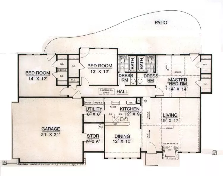 Designed for absolute simplicity and minimal cost of building, the layout of this contemporary design provides privacy for all of the bed rooms with access to the patio. The living areas all have glass exposure to the front of the house which makes it ideal for homes with a great view toward the front. The master has vaulted beamed ceilings and his and her walk in closets. Both of the secondary bedrooms have walk-in closets too. The living room has vaulted beamed ceilings and a great wood burning fireplace with a stone finish. The garage is sized to accommodate two vehicles and there is access from the garage into the utility room or into the bed room area. The galley kitchen is open to the well lighted dining area and there is an eating bar to maximize the number of guest that can be accommodated. The Utility room is easily accessed from either the kitchen or the garage and there is a very counter space for folding clothes and storing all of those cleaning items.