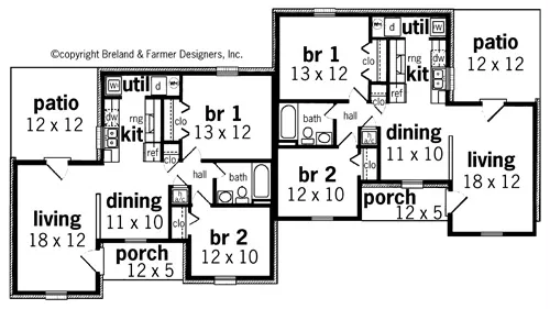 This duplex plan is a super energy saving design featuring 2x6 exterior walls and many other energy saving features. Each unit has a covered entry porch and private rear patio.