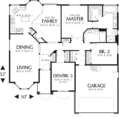 The right side of the home features the master suite and a second bedroom. A den completes the floor plan and provides the option for a third bedroom.