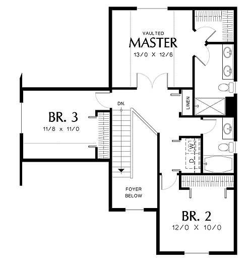 Double doors at the top of the staircase lead to the master bedroom with a vaulted ceiling. Look up in the bath. A skylight presents a view of the stars. The washer and dryer are in an alcove near the bedrooms and baths, where laundry is generated.