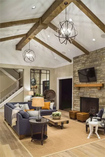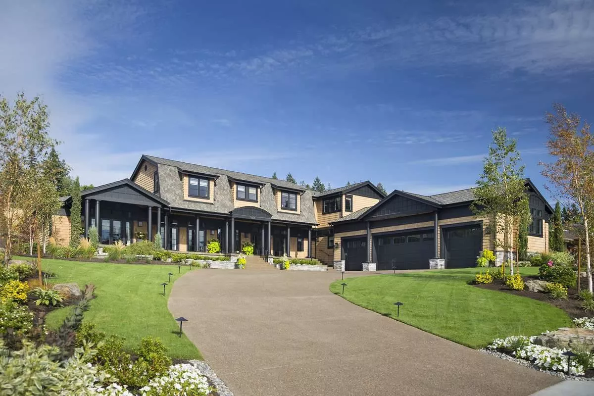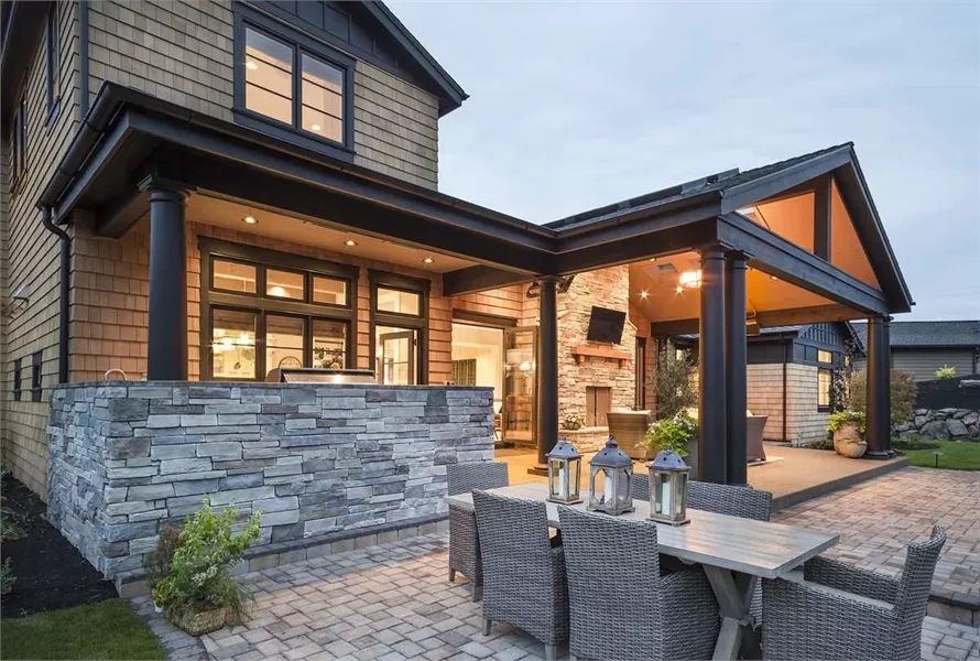 This four-bedroom home showcases columns and a gambrel roofline, giving it a Dutch colonial feel. Inside, the vaulted great room, warmed by a fireplace, is the primary gathering area. The fabulous island kitchen incorporates a snack bar for five. Note the additional outdoor entertaining areas. A fireplace enhances the vaulted master bedroom; a deluxe bath is anchored by a garden tub. The nearby den would make a great home office. Upstairs, three bedrooms enjoy three baths and a bright laundry room. The vaulted bonus room could serve as an art studio.