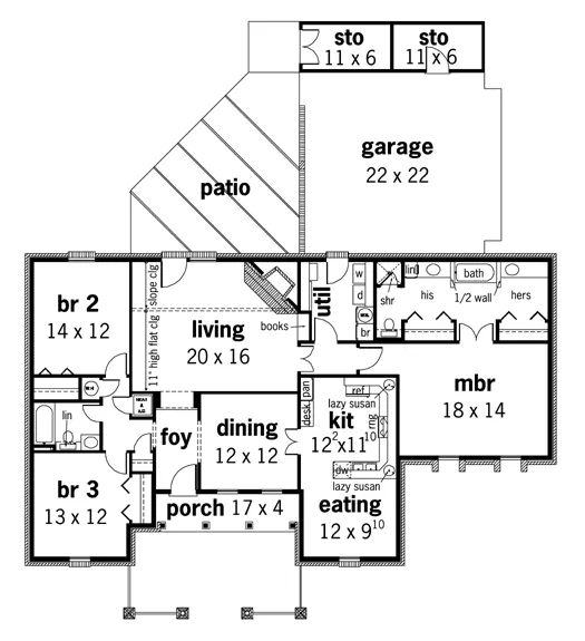 A U-shaped kitchen services the dining room and its own eating area. It also boasts a built-in desk, a handy pantry closet and access to the nearby laundry room and carport. The wide master bedroom hosts a lavish master bath with a spa tub, a separate shower and his-and-hers dressing areas. Across the home, the two secondary bedrooms share another full bath. This is a super energy saving design.