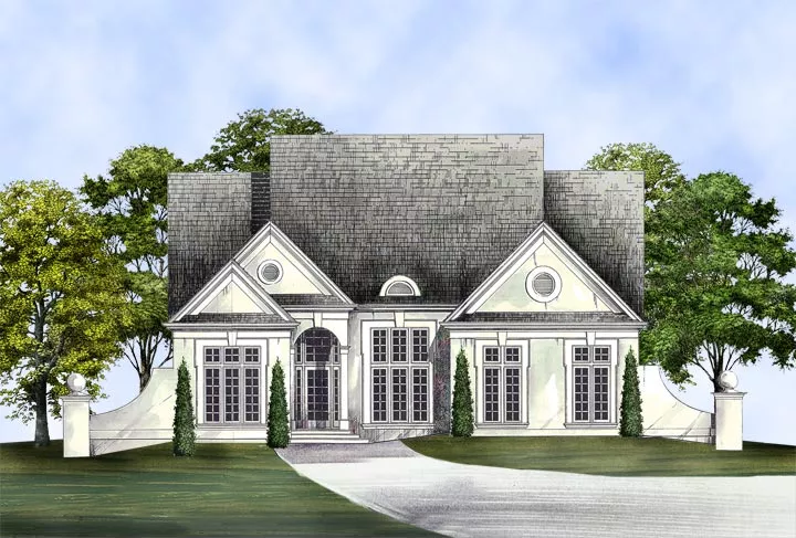 This plan almost looks like it has two stories, but the floor plan reveals that it is conveniently laid out on just one level. A huge great room/dining room combination dominates the front of the plan and accesses the galley kitchen. At one end, the great room offers double doors to a deck. Nearby is a warming hearth and built-in shelves. For casual occasions, consider the keeping room it features a bay window and a fireplace, plus a snack counter for easy meals. For those who work at home, there is a wonderful office just off the entry. The master suite is graced with deck access and a pampering bath. Two additional bedrooms, one with a walk-in closet share a full bath.