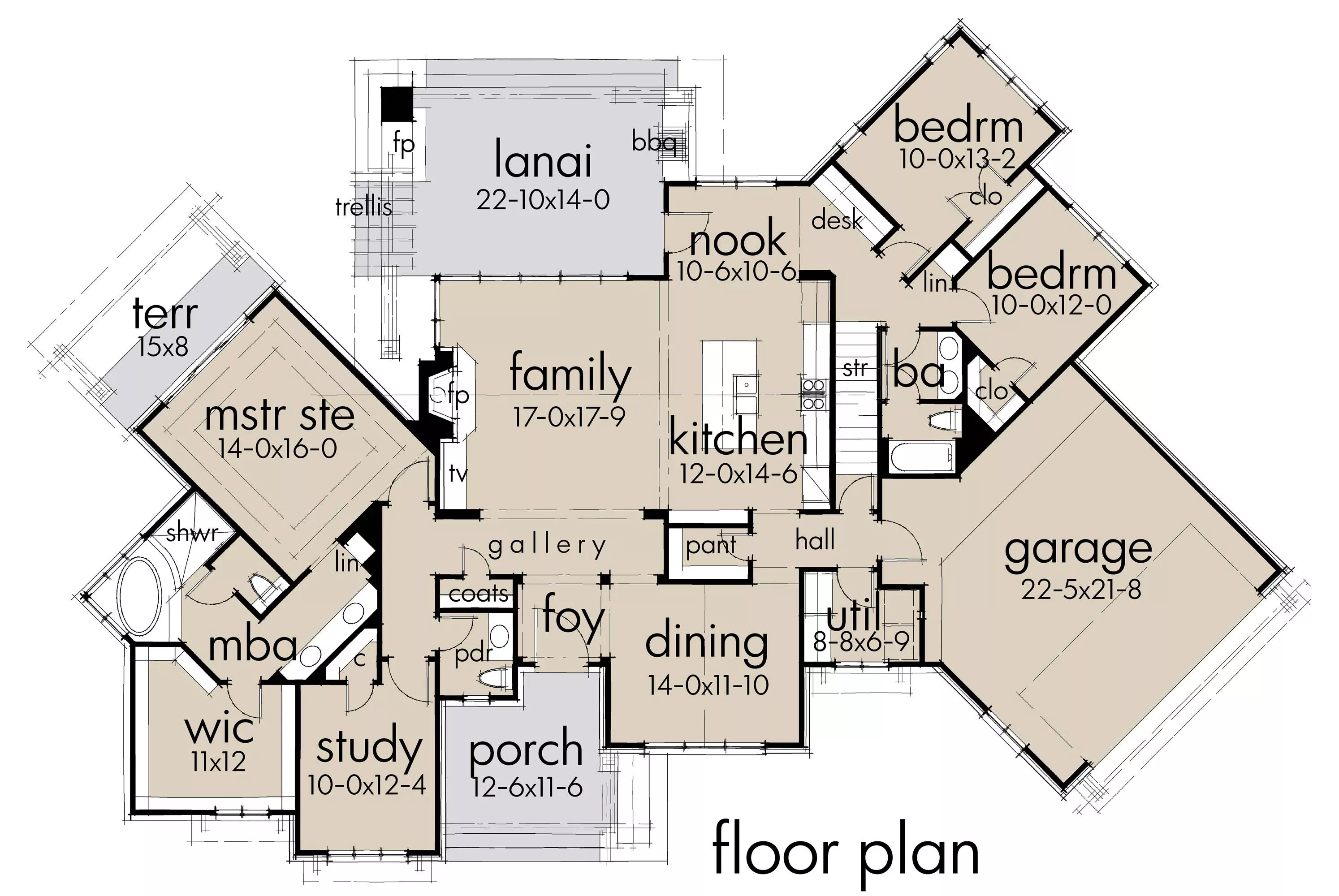 Clean lines and warm materials make this an exciting new design that's not only attractive by perfect for small families and empty-nesters. Low pitches make this home more affordable and cost effective to maintain. A wide open family/kitchen is bounded by a large corner window which is 10' tall and all the way to the floor. This provides a wide open view of your outdoor living areas or any scenic views that are available. Secondary bedroom are conveniently separated to the back and rear with a desk and access to a bonus/playroom. The stairs also lead to a basement from the utility room side. A large island kitchen has easy access to the dining, a walk in pantry and nearby utility area as well as the garage. The study doubles as a guest room and has a convenient powder bath adjacent to it. The master suite is strategically angled to provide separation from the family areas and add interest and a slightly more private covered patio. Angled double cedar beams frame the wide open view on the lanai bordered by a three sided fireplace that seems to defy gravity. Plenty of room for grilling and lots of niches to landscape in including a trellis to accent the corner view from the family. The master bath boasts a large walk in closet, corner tub with large view windows and a walk-in shower.