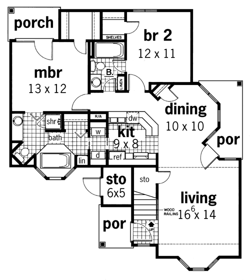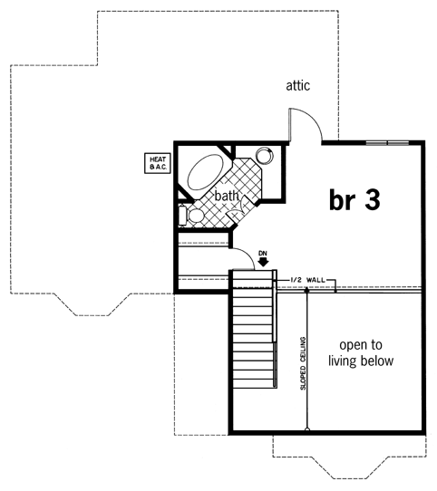 The master suite of this cozy cottage could be mistaken for a luxury home of much larger proportions. Features of the master suite include a private covered porch, king size walk-in closet and a bath fit for a king. The master bath has a large soaking tub with bay window surround, a separate shower, off-season wardrobe closet and a linen storage. Perhaps the most step saving feature is the utility room access from both kitchen and master bath. Both secondary bedrooms also have private baths and enormous walk-in closets. The open flowing design of the living and dining area is further accented by the sloped volume ceiling. The upper level balcony bedroom has a commanding view of the living area below. (The upper level bedroom can have a solid wall in lieu of the balcony railing)