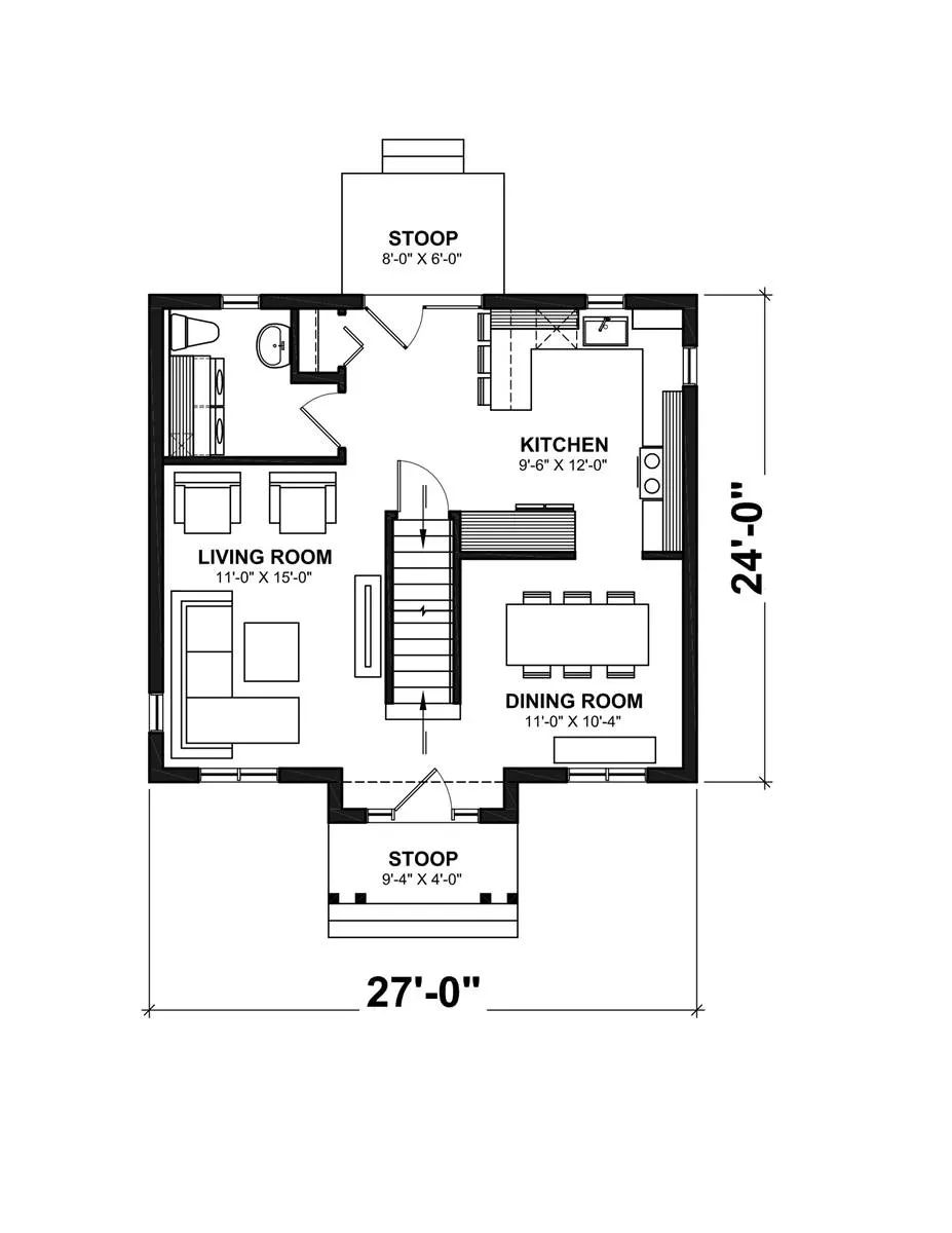 This 1,314 square foot house plan has two pairs of columns that support the entry canopy of      this sublimely symmetrical traditional home. Beautifully efficient, the entry branches left to the living area or right to the dining area. The kitchen enjoys a modern breakfast peninsula and efficient prep zone.Tucked discreetly in the corner, discover a combined half-bath and laundry. A functional pinwheel configuration at the top of the stairs minimizes wasted space and the bedrooms and bathroom are surprisingly roomy in a house with such a small footprint. Because of the simplicity of detail, it would be very economical to build allowing you to spend a bit more on quality interior finishes. Don’t forget, you also have a basement that can be finished if desired.