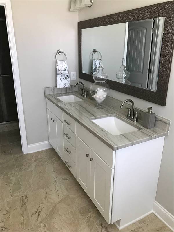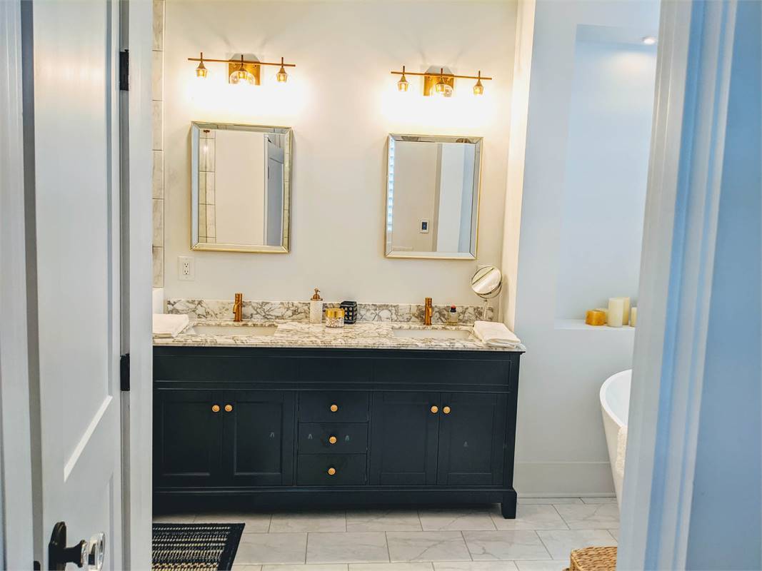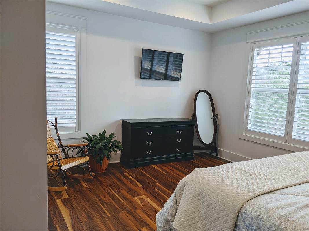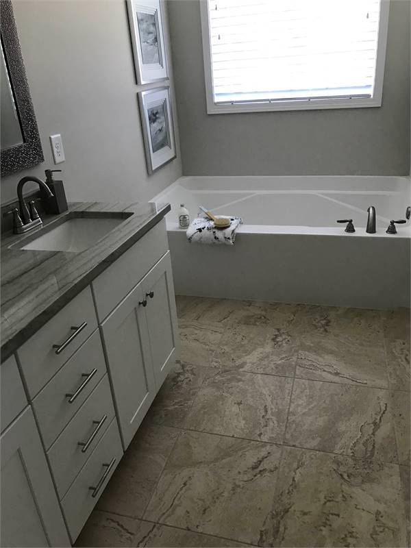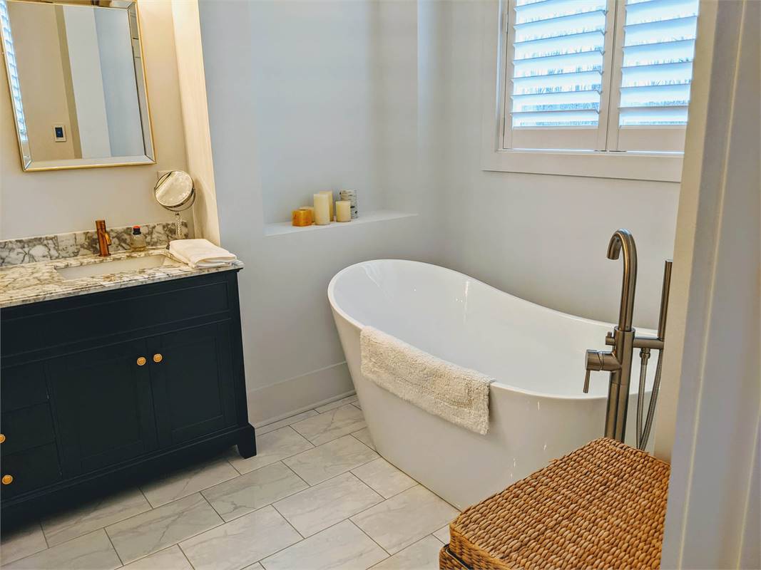 The master suite has access to the lanai via french doors and has lots of natural light and view. His and hers walk-in closets buffer the master bath from the bedroom. An over sized garden tub provides additional decoration space and a seat is included in the shower.