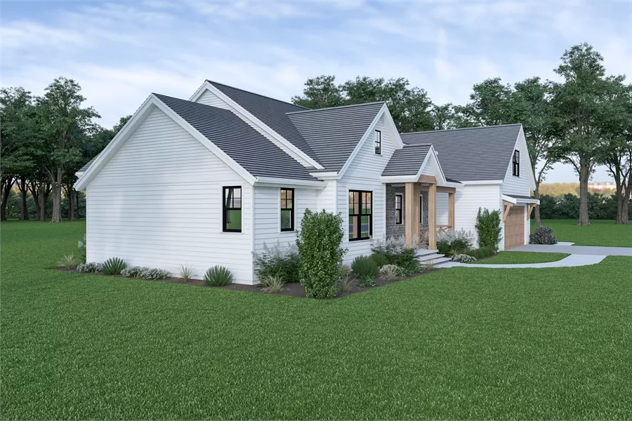 This home takes everything that you know and love about farmhouse-style plans and puts it into one amazing design. The ranch layout provides an open and accessible 2,401 square feet, including 3 large bedrooms and 2 full bathrooms. Not only does this home have tons of style inside and out, but it is also an affordable family plan. Notice the open spaces, including the island kitchen, family room and dining nook, all of which seamlessly join together. Other highlights include the master bedroom with its en-suite, as well as a 2-car garage and a covered patio.
