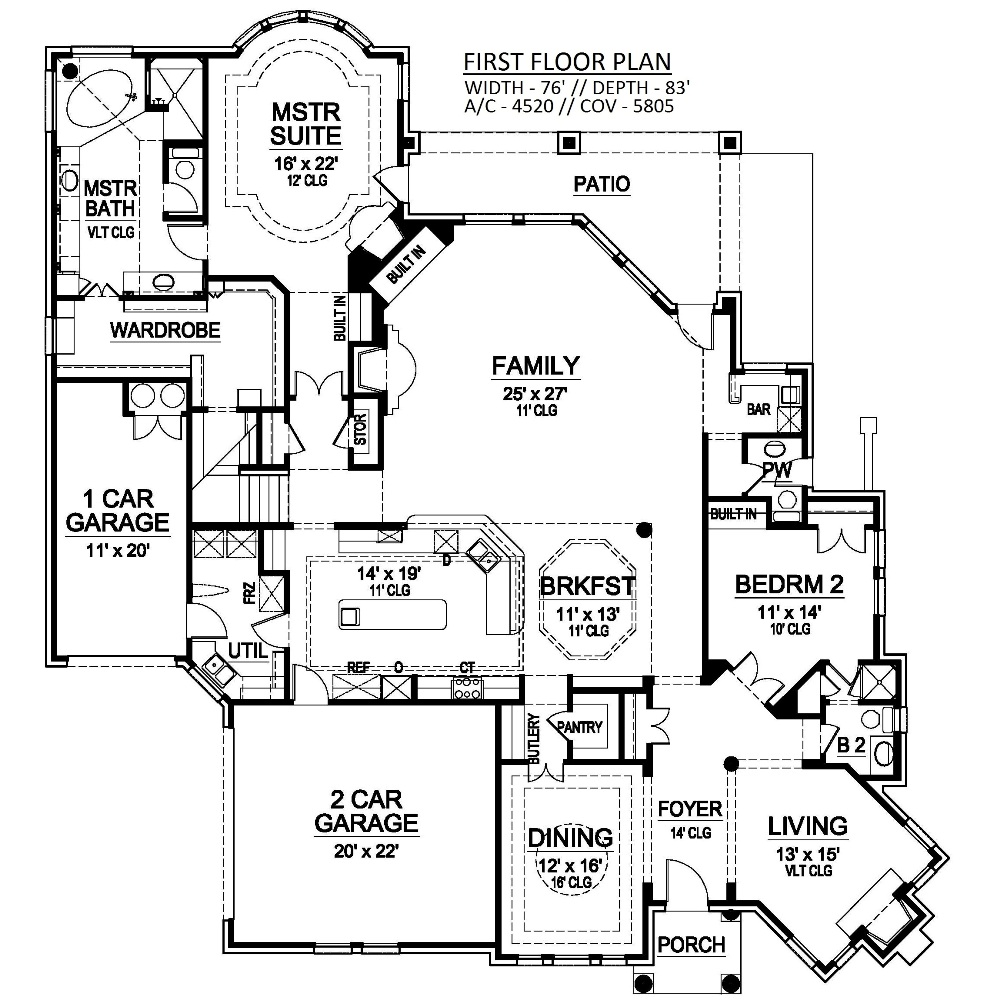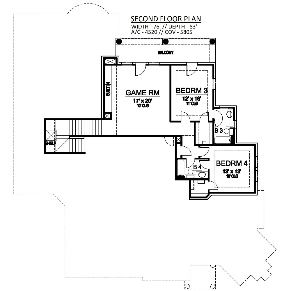 Upon entering the 14' foyer you'll notice the formal dining and formal living room that are on your left and right. On the left is the formal dining room with easy access to the butler pantry and the walk-in pantry, on the right is the formal living room is accompanied by a warming fireplace and a large decorative pillar. Just beyond the formal living room is a family bedroom with a walk-in closet, a built-in desk and a full bathroom, making this a great guest room. The kitchen, breakfast room, and family room are all open to one another making these rooms a great place for family gatherings. The kitchen boasts a large free-standing center island and breakfast bar for added counter space, and has easy access to the dining room through the butlery. Enjoy the fireplace and built-in shelves in the spacious family room, with its large bank of windows that allow for a great view of the backyard. The master suite features an interesting trey ceiling and luxurious bathroom; complete with his and hers vanity sinks, a corner garden tub, a separate shower and a large wardrobe. wrapping up the first floor is the utility room, one car garage and a two car garage, which all are connected to the kitchen. The second floor houses two family bedrooms with trey ceilings, walk-in closets and full bathrooms. A game room with built-in shelves and has balcony access, completing this elegant two-story house plan.