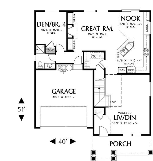 Packing great livability into a modest amount of space, this plan also features a facade with Craftsman details. A bonus room on the second floor adds a pop-out that dresses up the exterior. In classic style, living and dining areas in the home are found on the main level, and bedrooms on the upper level. Formal spaces are to the front; casual spaces to the back. The great room will be the center of family gatherings, near the nook and island kitchen. Its hearth is flanked by built-ins. A den or guest bedroom is tucked behind the two-car garage and maintains the use of a full bath. The upper level contains two family bedrooms, plus the master suite and a bonus space that could become an additional bedroom. Both the bonus room and the master bedroom feature scissor-vaulted ceilings. The master bath is a haven of repose with a spa tub, separate shower, dual sinks and compartmented toilet.