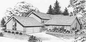Wood and brick siding provide an informal appeal to this L-shaped multi level two story. I divided the first floor into two levels, almost like a split-level, with the informal family room located at the lower level, down a few steps from the kitchen. The foyer opens to a view of the cathedral-ceilinged living and dining rooms and to the rear patio through the breakfast area/kitchen. The family room includes a corner fireplace and sliders to the rear patio. At this same level is a den or optional fourth bedroom, a full bath and a spacious laundry room adjacent the garage. An expansion attic includes bonus space for another bedroom- or playroom, if desired.