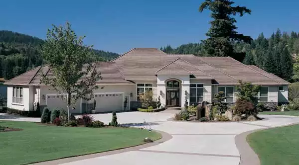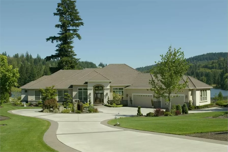 At the heart of the home, the great room is spacious enough for several furniture groupings: Create a viewing area in front of the fireplace and media center; position a games table in the bow window; arrange a quiet study area or reading nook in a corner. The family cooks will delight in the large kitchen. It's superbly equipped with a walk-in pantry, wall oven, planning desk, and an angular island, complete with self-venting cooktop and snack counter. A French door in the dining nook leads to a patio and covered deck. The large laundry room is fully furnished with a sink, cabinets, countertop, and a built-in ironing board. A dream come true, the master suite features double door entries and tall decorative tray ceilings. The bath houses a whirlpool tub in a windowed corner alcove, a walk-in shower plumbed with two showerheads, linen storage, and a private toilet compartment. The two additional bedrooms share a compartmentalized bath, drenched in sunlight by a skylight.