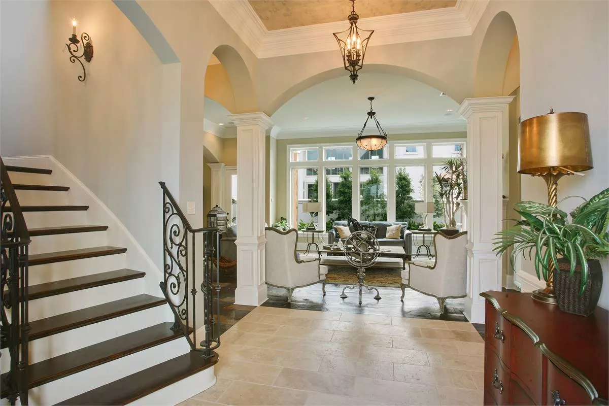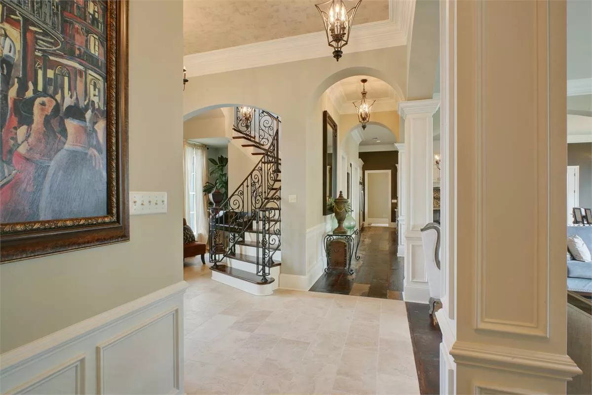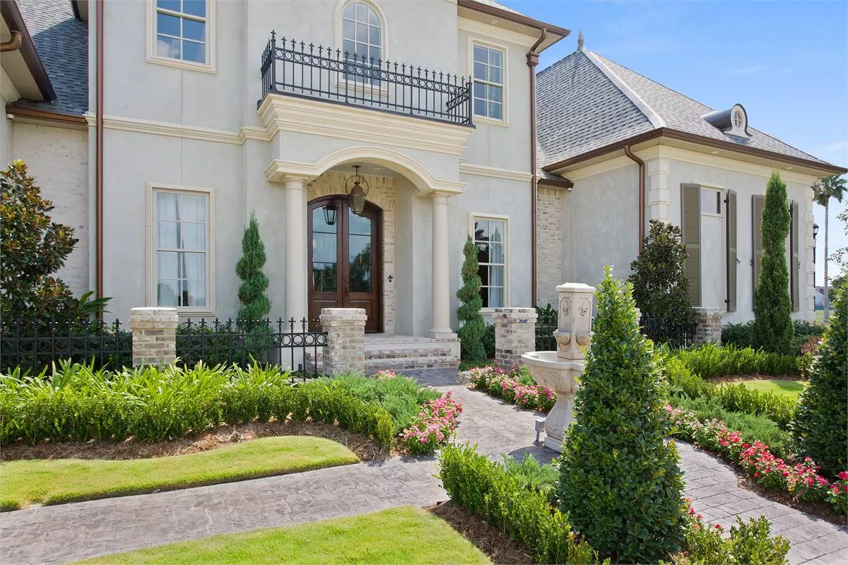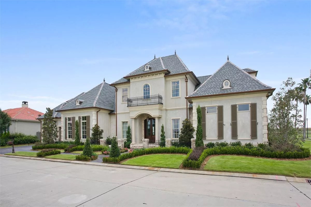Dignified symmetry is the hallmark of this five-bedroom European design. Guests are warmly welcomed in the foyer, and ushered into the spacious family room for good conversation by the fireplace. When dinner is ready, another fireplace enhances the formal dining room. The island kitchen is "magnifique," with its endless counter space and bright breakfast nook. Note the handy catch room, where laptops, briefcases and other belongings may be deposited, keeping clutter out of sight. How will you use the studio space behind the garage? Perhaps you're a budding artist! At the end of a long day, retire to the luxurious master suite. Your guests will appreciate having their own designated quarters. Three more bedrooms and other unique spaces are found on the upper level.