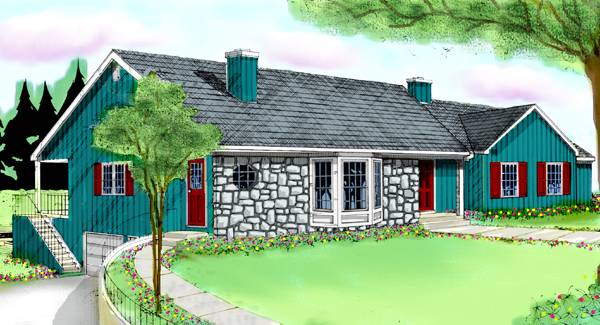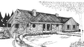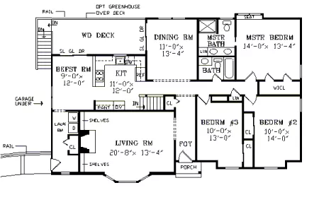 This home offers lots of opportunities for enjoying the outdoors, with its lavish use of glass, large patio and wood deck or optional greenhouse. The rustic exterior sports vertical cedar siding contrasted with stone veneer. The home's tuck-under garage and rear-view orientation make it perfect for scenic lots on a slope. The large living room includes such extras as built-in shelves, a bay window and a fireplace. The two dining areas and the central kitchen all face the rear deck. Plenty of glass in each room offers great views of the outdoors. Converting the deck into a greenhouse adds 168 sq. ft. of space. The two bathrooms and the foyer are arranged to help buffer the bedrooms from the main living areas.
