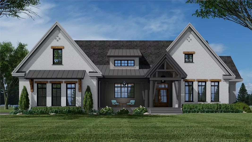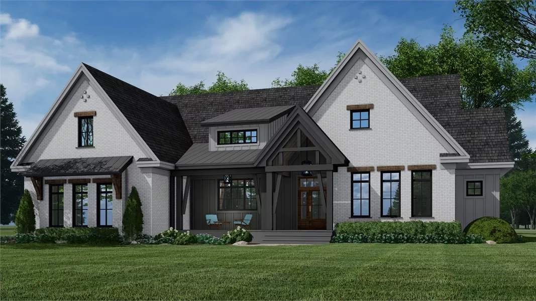 Perfect for most lots, this adorable 2,336 square foot, 3 bedroom 2.5 bath ranch farmhouse plan is both spacious and beautiful. A one-story design features family style bedrooms and an open floor plan.  Ample attention was paid to every detail of this layout, resulting in a wonderful family-oriented home.  The main level flows easily between the kitchen, dining and great room with access to the front and rear covered porches. There are multiple garage design options including a 2 or 3 car front or side entry.