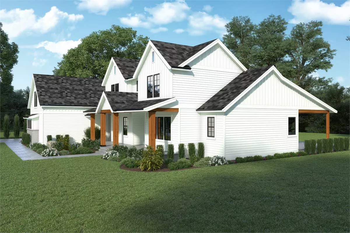If you need a spacious modern farmhouse for a family, take a look at House Plan 9797! This lovely two-story design has 4,003 square feet and four split bedrooms. The master suite is located on the main level and the other three are upstairs--one is a private bedroom suite while the other two share a Jack-and-Jill bath. The main living spaces include a vaulted great room, a dining room, and a U-shaped kitchen with an island and a nook with built-in seating. There's also an office for the at-home worker! The three-car garage has a bonus accessible from the second story above it, so you can complete this home with a game room, play room, or anything else you need.