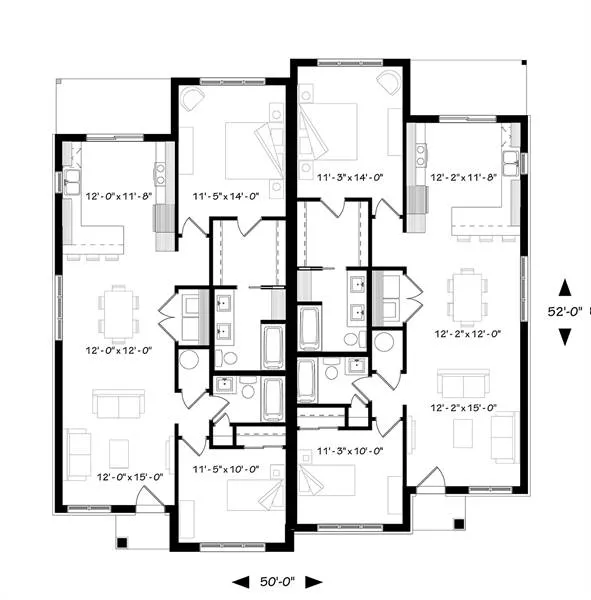 The duplex home plan is designed with the outward appearance of a single-family dwelling, yet feature two-distinct entries. These type of homes are popular among customers in densely populated areas such as cities where there is demand for housing but limited space. This plan features 1,125 square feet per unit and was designed for a couple or a family wishing to have no basement which allowed us to use the space that would have been reserved for a staircase (leading to the basement) and maximize the overall square footage. It should be noted that the ceiling height of the entire main floor is 9 feet high, which gives significant amplitude to the rooms. The kitchen is good in size and features a lunch counter, convenient for chatting with guests while preparing meals. In addition, a covered balcony is accessible from the kitchen making it easy to access a BBQ, for example. The dining room area and living room (lounge) are very open. The space is large enough to accommodate a table of 6 to 8 people and good size living room furniture. The master bedroom suite receives natural light from a large window overlooking the back yard. There is also a large walk-in wardrobe. A private bathroom with shower and double vanity, as well as a linen room.  A secondary bedroom is located on the front of the house and is adjacent to a full bathroom. This room could easily convert into a home office or home gym.