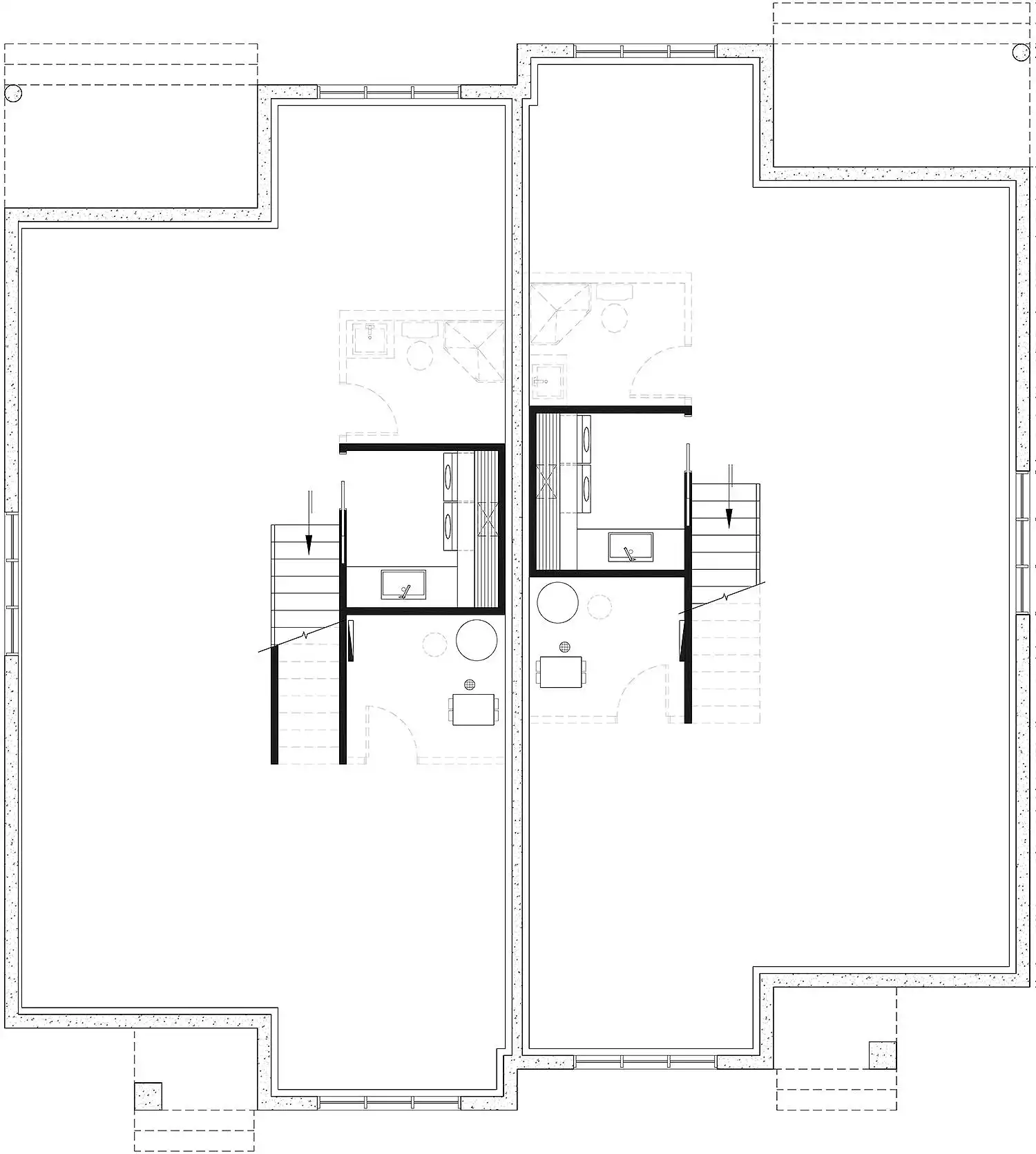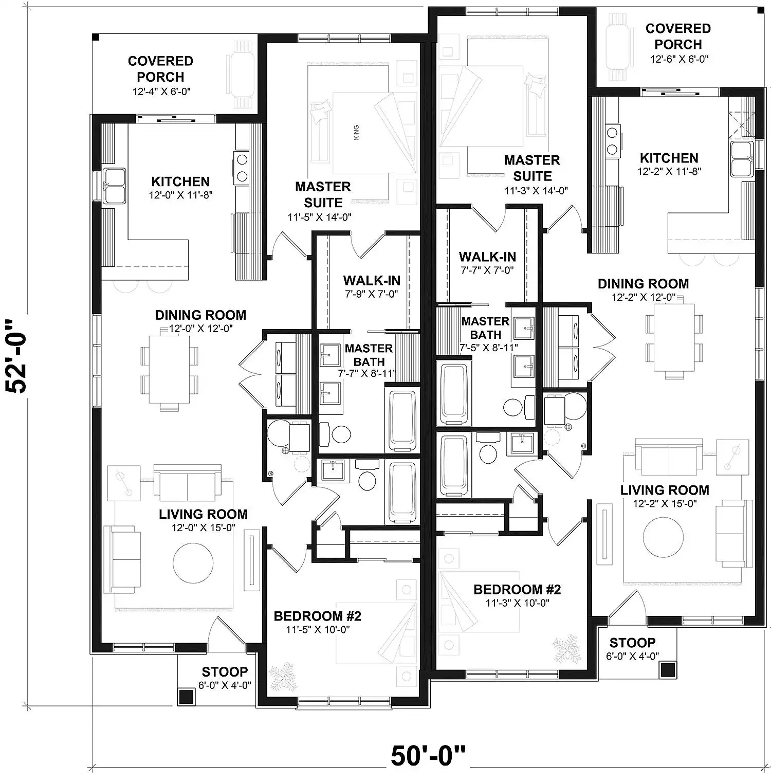 The duplex home plan is designed with the outward appearance of a single-family dwelling, yet feature two-distinct entries. These type of homes are popular among customers in densely populated areas such as cities where there is demand for housing but limited space. This plan features 1,125 square feet per unit and was designed for a couple or a family wishing to have no basement which allowed us to use the space that would have been reserved for a staircase (leading to the basement) and maximize the overall square footage. It should be noted that the ceiling height of the entire main floor is 9 feet high, which gives significant amplitude to the rooms. The kitchen is good in size and features a lunch counter, convenient for chatting with guests while preparing meals. In addition, a covered balcony is accessible from the kitchen making it easy to access a BBQ, for example. The dining room area and living room (lounge) are very open. The space is large enough to accommodate a table of 6 to 8 people and good size living room furniture. The master bedroom suite receives natural light from a large window overlooking the back yard. There is also a large walk-in wardrobe. A private bathroom with shower and double vanity, as well as a linen room.  A secondary bedroom is located on the front of the house and is adjacent to a full bathroom. This room could easily convert into a home office or home gym.