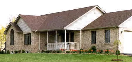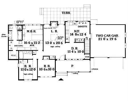 This plan puts today's most luxurious home-design features into one attractive, economical package. The covered front porch and the gabled roofline, accented by an arched window and a round louver vent, give the exterior a homey yet stylish appeal. Just inside the front door, the ceiling rises to 11 ft., offering an impressive greeting. The spacious living room is flooded with light through a central skylight and a pair of French doors that frame the smart fireplace. The living room flows into the nice-sized dining room, also with an 11-ft. ceiling. The adjoining kitchen offers a handy laundry closet, lots of counter space and a sunny dinette that opens to an expansive backyard terrace. The bedroom wing includes a wonderful master suite with a sizable sleeping room and an adjacent dressing area with two closets. Glass blocks above the dual-sink vanity in the master bath let in light yet maintain privacy. A whirlpool tub and a separate shower complete the suite. The larger of the two remaining bedrooms boasts an 11-ft.-high ceiling and an arched window.