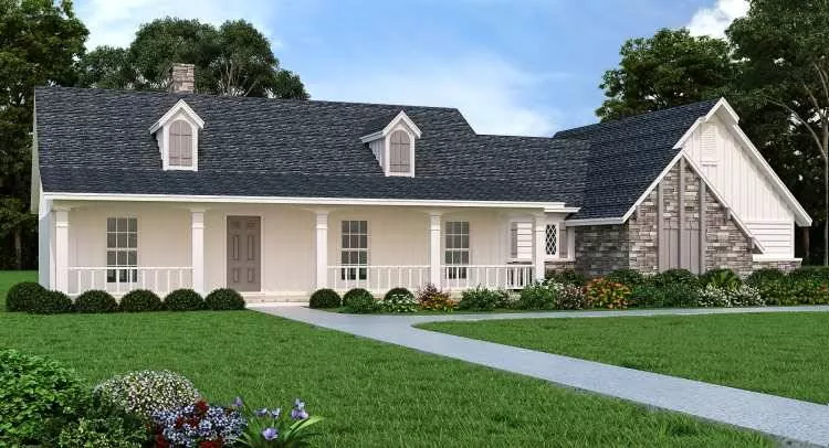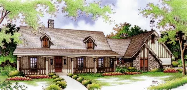 This home design is based upon a few, still existing but long abandoned frontier homes of the Deep South. Like most homestead structures built in the Deep South in the 1800s, the initial home was a simple one-room structure. The entire family lived in the one room while the main home was being built just steps away. After the main home was completed, the original structure was used as a kitchen and was often joined to the main home with a breezeway. As means became available, shed porches were added across the front of the main house and as the family grew, attic spaces were taken in and dormers added to accommodate the need for more space. These historical steps were retraced in creating the exterior faade of this rustic cottage design but the interior is totally modern. It is a super energy saving design featuring 6 exterior walls and a host of other low cost features designed to save loads of utility cost. The kitchen and the master bath have windows encased with sidewalls to hold glass shelves for displaying your favorite plants. The master suite has built in bookshelves and a private sitting area. The built in pantry and sewing area make the kitchen a dream for the active homemaker. Living room features include a sloped beamed ceiling and a massive stone-faced wood-burning fireplace.