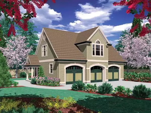 This three-car garage plan has so much more than just vehicle storage: It also has a full two-bedroom guest suite above. The exterior is appealing with lap siding and arched garage door.