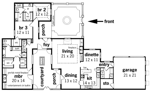 Designed to resemble the look of an aged European cottage, this home will fit onto a very compact site. The courtyards are designed to provide maximum privacy in high-density surroundings. Most ceilings are 10 but the Living Room boast 16 ceilings with a massive glass wall overlooking the entry courtyard. The living room has a built-in wood-burning fireplace flanked by built-ins. There is a second fireplace in the plush master suite providing a great atmosphere for those romantic evenings. The master bath includes two walk-in closets, soaking tub, shower, twin vanities, linen closet and a private room for toilet and bidet. This is a super energy saving design with 2x6 exterior walls.