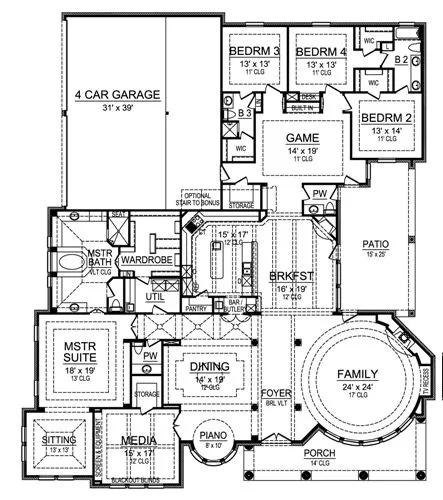 This luxury starter castle home plan has awesome room styles and special ceiling treatments. You'll appreciate the four bedrooms. Entry through the double front doors into the barrel vaulted foyer offers plenty of large decorative pillars that define the various rooms. The stunning circular family room has built ins, a warming fireplace, a round tray ceiling, and access to a side patio. The breakfast area flaunts a 12-ft. ceiling, a second fireplace, and patio access. Dividing the kitchen from the breakfast area is the breakfast bar with sink and dishwasher. A free-standing island adds plenty of granite counter space. The kitchen, pantry and bar/butlery are directly accessible to the dining room for ease in serving. A circular piano room with high windows allows sunlight to come streaming through. The master suite boasts a tray ceiling and a sitting area. The vaulted bath showcases his and hers vanities, a large garden tub and separate shower and a large wardrobe. A utility room is also accessible from the wardrobe. Behind the breakfast area is a game room, plus three family bedrooms with walk-in closets and full baths. For the alternate two-story version of this beautiful home plan, ask us about the Gray Hawk.