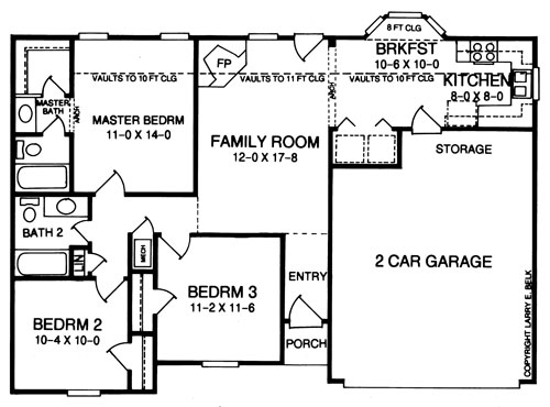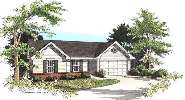 Siding with brick wainscoting distinguish the elevation of this compact plan. A large Family Room with corner Fireplace is the centerpiece for this small but livable home. An arched opening leads to the Breakfast area with bay window and the efficiently designed Kitchen. The Master Bath is designed with a separate vanity area for privacy and convenience. Two additional Bedrooms and a Bath complete the plan.