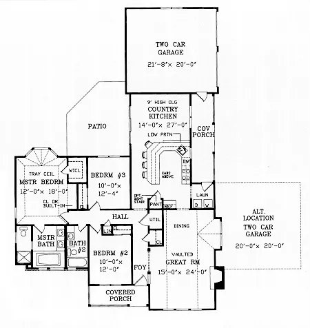 Highlighted by skylights, clerestories and transom windows, this lovely country home soaks in the sun. The great room/dining room is enhanced by a soaring 17-ft.-high sloped ceiling and a bright boxed-out front window. The beautiful rear facing country kitchen enjoys an island counter and a bay-windowed breakfast room with deck access. The luxurious master bedroom has an elegant tray ceiling and delightful master bath. This plan can be built with an attached garage in either of two locations, or with a detached garage, if you prefer.