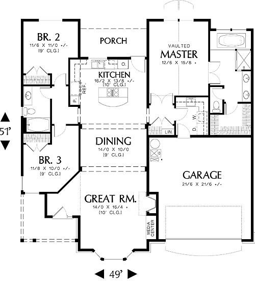 The vaulted master suite provides all the amenities and comfort: a walk-in closet, spa tub, enclosed toilet, and dual sinks. It is assured privacy- the additional bedrooms are located across the home in their own hallway.