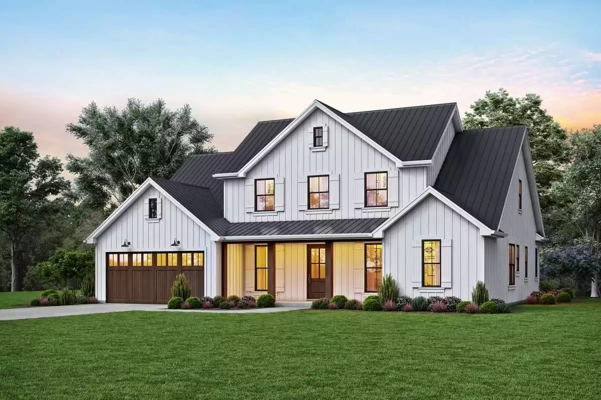 A stunning take on an exceedingly-beautiful design, this modern farmhouse is as appealing as it is functional. A comfortable 2-story layout offers 3,032 square feet of living space, including 4 large bedrooms. Notice just how much is offered on the first floor alone! Past the appealing facade, step inside to discover and open concept layout which begins in the foyer and flows throughout the vaulted great room and into the dining room and chef's kitchen. It's even present in the covered outdoor porch with its own full kitchen space! You'll also enjoy the addition of a private study and the accessible first-floor master suite, along with its large closet and even larger bath. Upstairs finds the rest of the bedrooms, along with an open-air loft and a full guest suite, a great and private space.