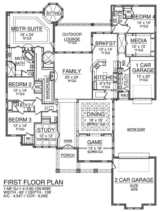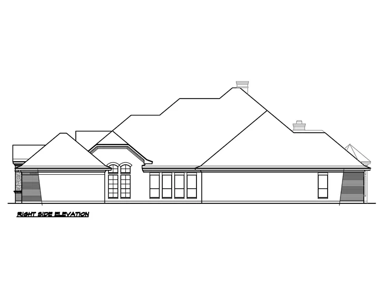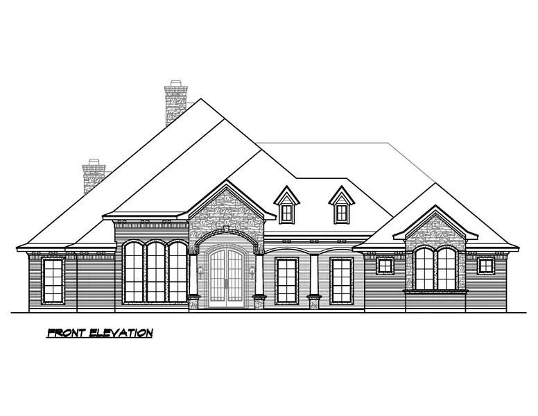 This 4,647 sqft, 4 bedroom 3 bathroom house plan offers varied roof styles, arched Georgian glass block windows, a turret, a stone facade, and a lot of French country charm. Through the covered porch, as you enter the stunning foyer of this luxurious home, you immediately have a view of the overwhelming groin vaulted ceiling that leads into the elegant dining room and a sloped ceiling game room. Ahead is the 14’ ceiling family room with dramatic fireplace and a wall of windows from which to peer out onto the outdoor lounge with its large decorative columns. A gourmet kitchen offers a built-in pantry, free-standing center island, modern, state-of-the-art appliances, granite counter top, and a breakfast bar that seamlessly separates the kitchen from the family room and breakfast area.