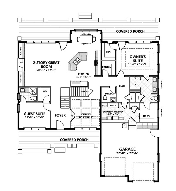 A columned front porch makes for a welcoming entrance for this stunning two-story Craftsman house plan featuring 3,000 s.f. The main level offers Formal Dining as well as a Guest Suite with a private bath. A generous Laundry/Mudroom is complete with cabinets, sink, counter space and bench seating. The large Kitchen boasts a sunny Breakfast Nook, Walk-In Pantry and an angled sink with an eating peninsula opening into the 2-story Family Room with a fireplace and French doors leading out onto an expansive Covered Porch. The main- level Master Suite provides a luxurious retreat with double vanities, large walk-in shower and an HIS and HERS walk-in closets. On the second level are two large Family Bedrooms, a Home Office and two Full Baths. There's also plenty of unfinished space for Storage or a future Bonus/ Recreation Room.