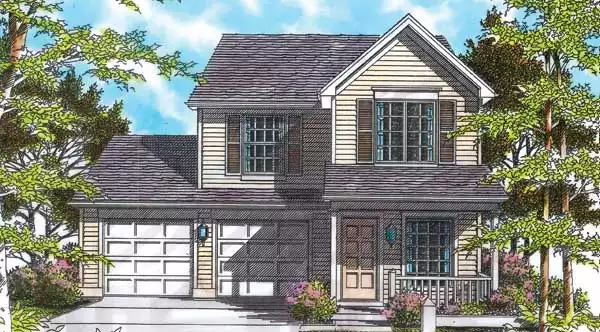 A wealth of practicality is designed into this home. In the U-shaped kitchen, the sink, range, and refrigerator are arranged in a triangle to create the most efficient work flow. A pantry with sliding doors supplements storage space. A built-in desk sits beside the pantry. Anchored by a square column, the sink peninsula is open to the dining room and includes a snack counter. The upper floor hosts the master suite, three additional bedrooms, and a bath. The laundry room also is up here, handy to the bedrooms and baths where most laundry is generated.