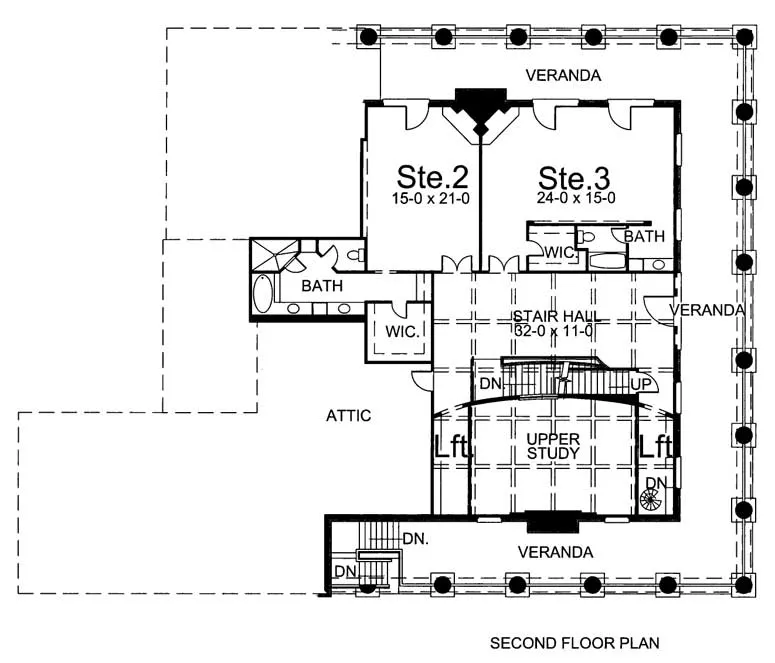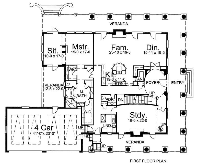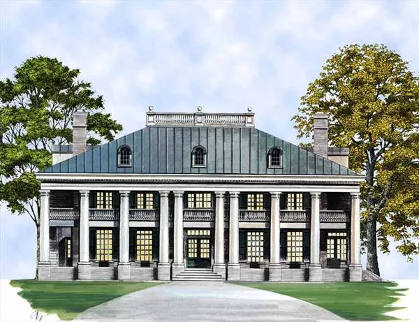 A symmetrical exterior surrounded by imposing two-story pillars and dual-level wraparound balconies is awe-inspiring. The lush first-floor master suite opens to verandas from two sides and enjoys a sitting area washed by sunlight. A mammoth two-story study with its own spiral staircase to a loft where bookshelves can be placed will have special appeal. A semicircular bar-counter separates the kitchen from the family area and promises to be the place where family members hang out for snacks, light meals, and conversation. A fireplace in the family room adds warmth and comfort. Two suites with full baths, walk-in closets, and access to the upper-level balcony are located upstairs. The plan also includes a carport with space for four vehicles.