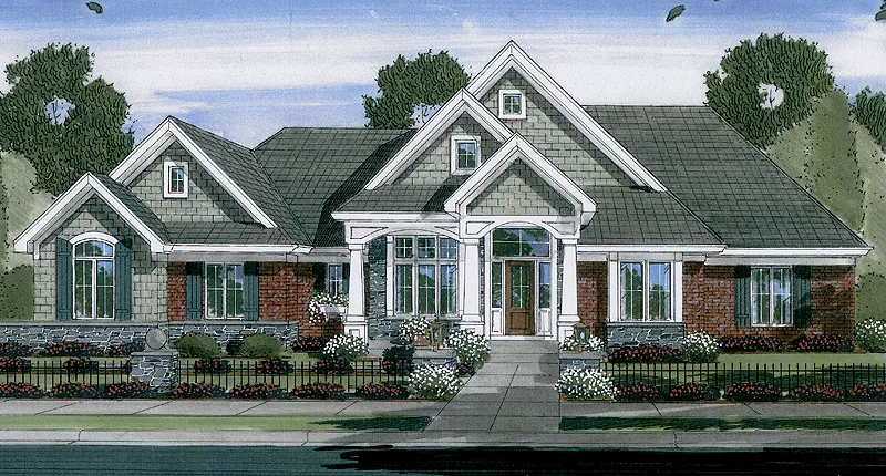 This one level home offers large rooms, high ceilings, indoor and outdoor living areas and a beautiful front facade with stone, brick and shake siding. The master bedroom enjoys his and her vanities, a shower and whirlpool tub. Formal and informal dining provide an abundance of space for any occasion. A mud room with closet space creates an orderly transition from the garage to the kitchen. A secondary bedroom and library complete the first floor of this beautiful home. A full walk-out basement foundation comes with this plan an can be finished for additional square footage.