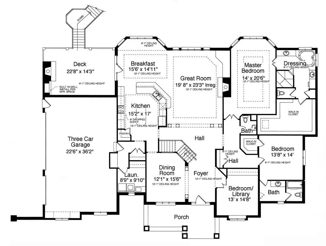 Enter through the covered porch into the foyer where you will immediately be flanked by a bedroom/library on your right and a dining room on your left. Straight ahead is the large Great Room with a fireplace that is easily viewed from the breakfast nook and kitchen.
