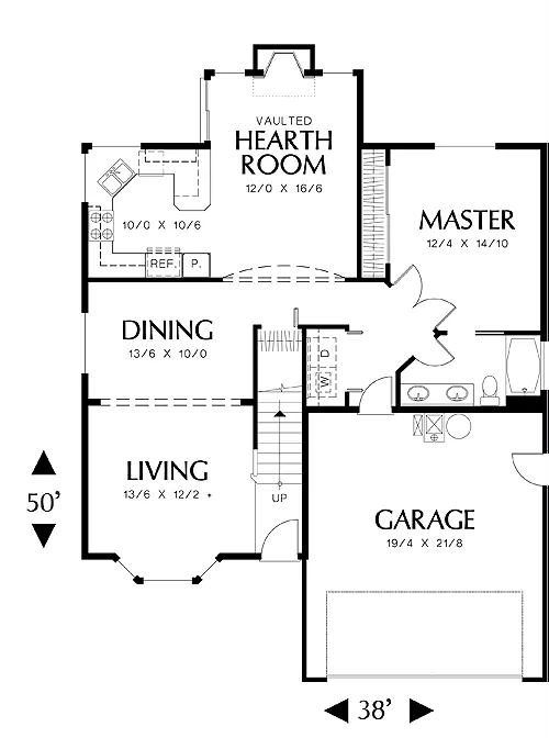 Quaint and comfortable, this Cape Cod plan offers split-bedroom planning, with the master suite on the main level and family bedrooms upstairs. Horizontal siding on the exterior complements two dormer windows and high gable roof, in the Colonial tradition. Living and dining rooms are open to one another; the living room features an enchanting bay window. For more casual occasions, the hearth room is vaulted, has a fireplace and is near the modified C-shaped kitchen. Tucked behind the garage, the master suite has a private bath and long wall closet. A laundry alcove graces the service entry to the two-car garage. The upper level has a wonderful balcony overlook in the hall, which separates the second-level bedrooms. Note the dormer window in Bedroom 2 and linen storage just outside Bedroom 3. Convenient attic storage opens from the upstairs hall.