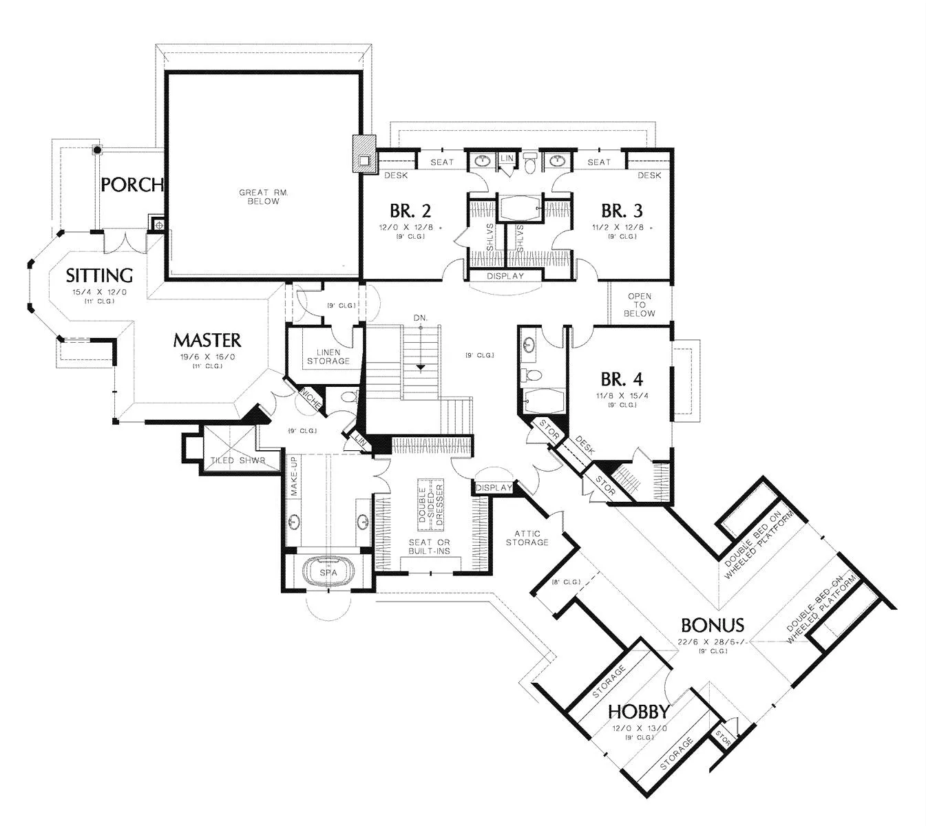 A bonus space and hobby room above the garage also can be developed into specialty spaces, such as a home theater, a game room, a teenager hang-out, and a childs playroom.
