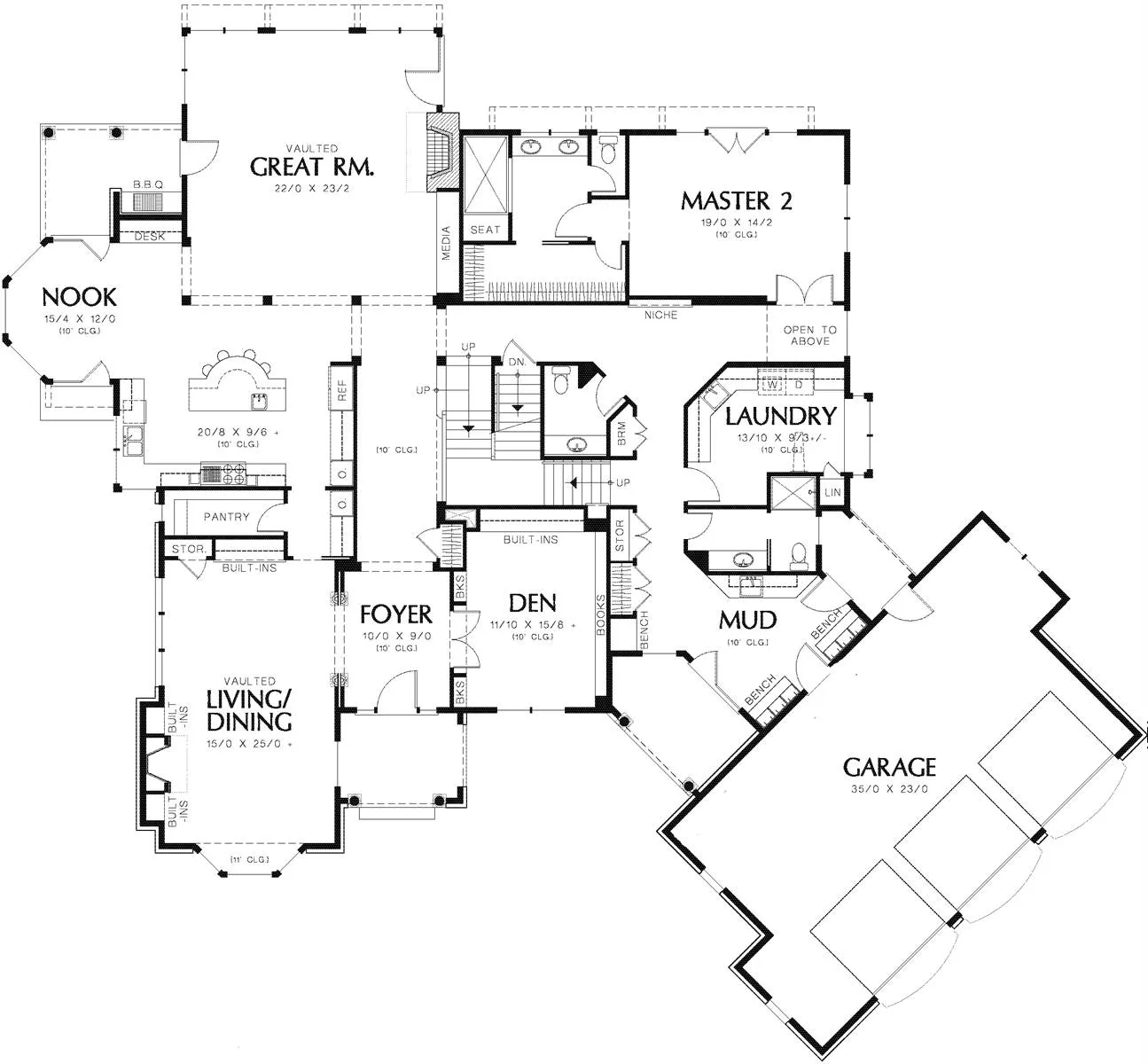 This home, with its European country touches, denotes the feel of a casual estate where all your needs are met. With 6,775 square feet of living space, the features are indeed plentiful. Yet, the floor plan is refreshingly versatile. To begin with, the home offers two master suites - one on the main level and one on the upper level. One of the suites could be designated for a live-in relative, or the owners could plan to use the upper-level suite, which has more lavish features, such as a bay sitting room, walk-in shower, and dressing closet with a built-in two-sided dresser until their later years, when single-level living has more appeal. Moreover, one of the suites could even be saved as a self-contained guest suite for frequent out-of-town visitors. Between the large, sun-filled breakfast nook, the formal dining room, and the circle-shape snack bar, the floor plan features plenty of dining space, so huge family dinners are easily accommodated. Dining space in the breakfast nook even extends outside to a patio, which features a built-in outdoor kitchen and barbecue area. A den, located across the foyer from the formal living and dining room, can be fashioned as a secluded retreat, or tailored to the needs of a work-at-home professional. Front and side entrances lead into a large mudroom with storage cubbies, closets, and a clean-up sink so the main parts of the home can stay tidy.