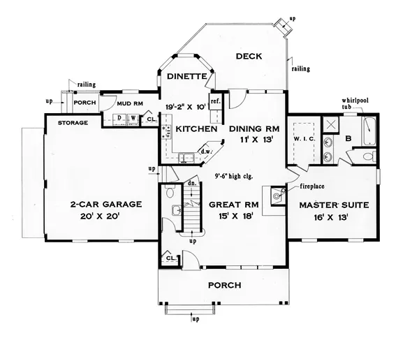 The large Great room has an interior fireplace and flows into the formal dining area which has three French doors, one of which leads out to a rear deck. The ceiling height is 9'-4" here. The dramatic, angled kitchen is located to the left of the dining room and has a pass-through to the dining and Great rooms. The laundry or mud room connects to the kitchen. It has a pantry closet and leads to the rear porch. The first floor master suite is accessed from the Great room and forms its own wing. This suite contains a five fixture bath and a large walk-in closet. Two good sized bedrooms with generous closets are located upstairs. They share a hall bath.