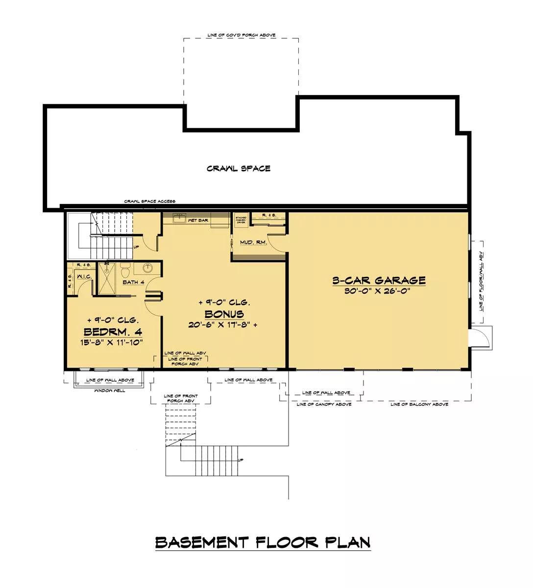 The front elevation showcases the sprawl of the 2 level daylight basement home with its width of 73’6” and a depth of 46’6” and it elevates the curb appeal with the use of wall to wall windows and the low pitch roof lines.