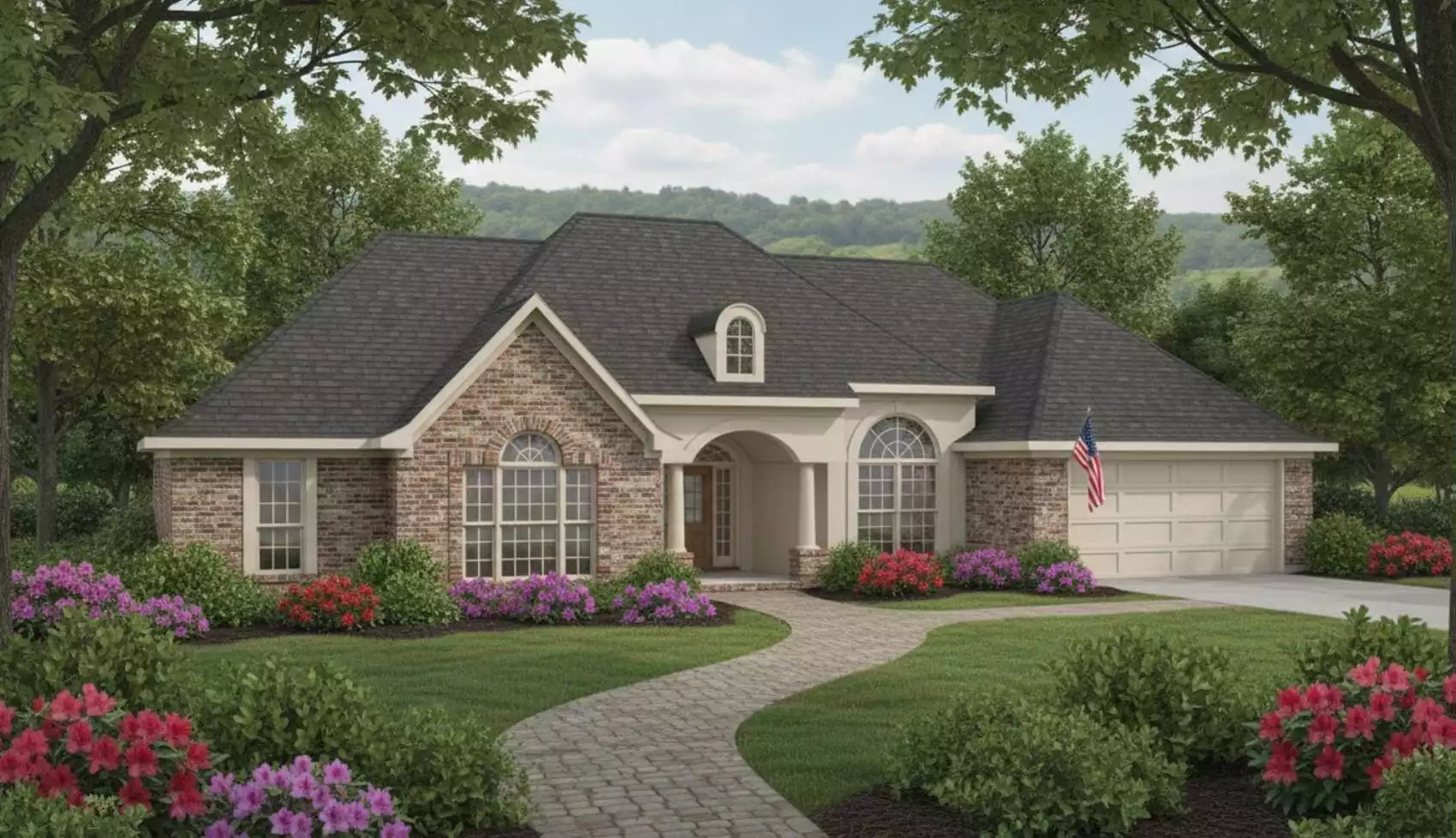 A graceful stucco arch supported by columns sets this elevation apart at the curb. An angled Foyer steps down into the Living Room to the left or the Dining Room to the right. The Family Room, Kitchen and Breakfast Room are grouped together to provide for family gatherings and informal entertaining. The Master Suite is entered through double doors with a luxury Master Bath. Two additional Bedrooms and a Bath are located on the opposite side of the home.