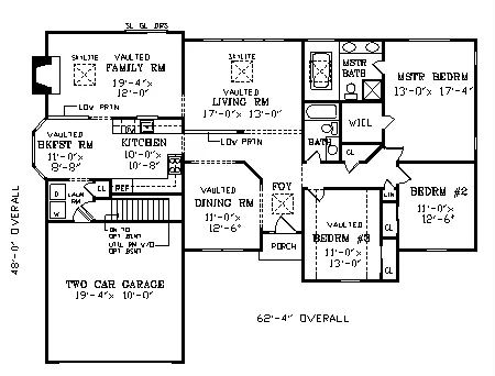 Skylights brighten the interior of this three-bedroom ranch,while vaulted ceilings hover above the spacious family room, central living room, bayed breakfast room and dining room. I designed only a half-wall to separate the breakfast area from the family room, which features a fireplace and sliders to the patio. A roomy master bedroom is secluded to the rear; it offers a generous walk-in closet and a private bath with twin vanities and a skylit tub. Two additional bedrooms share a second full bath.