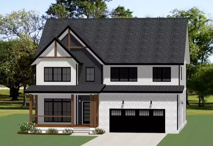 With its use of mixed materials of a shed ribbed metal roof on the lower level covering the porch to the wood accents, this plan melds hints of craftsman with the classic lines of modern farms.